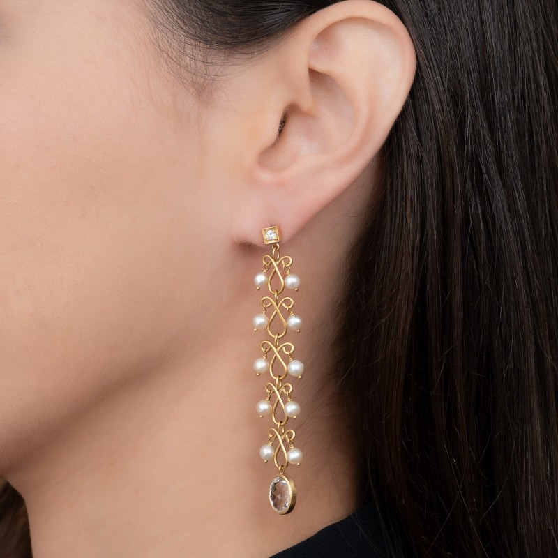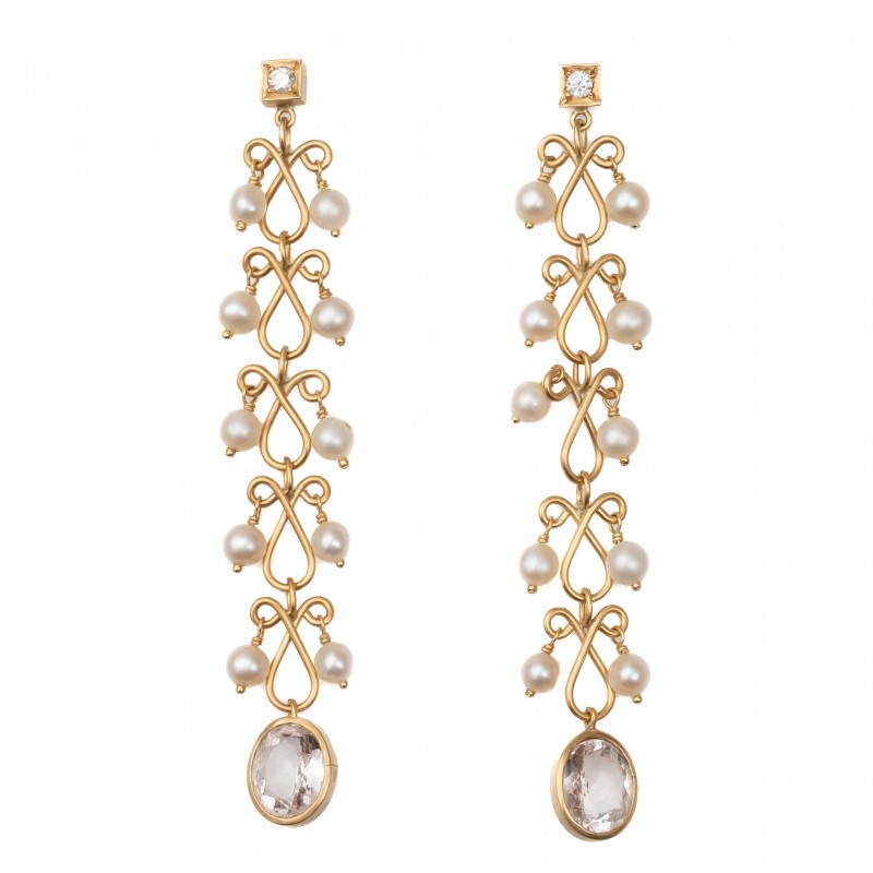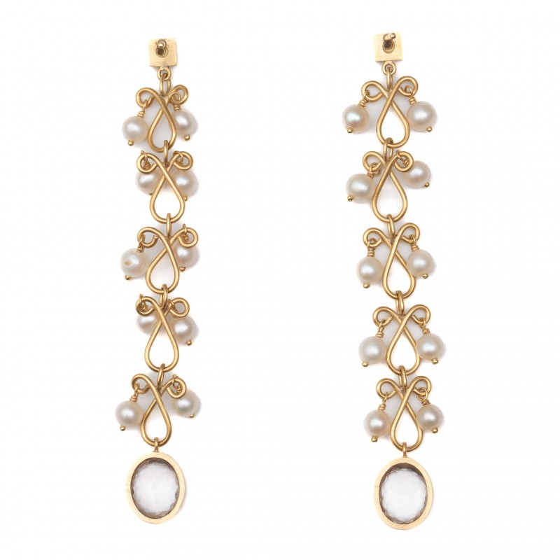 Em ouro amarelo 18K Com mini pérolas, cristal e diamante Peso 9g Medida 7.4g