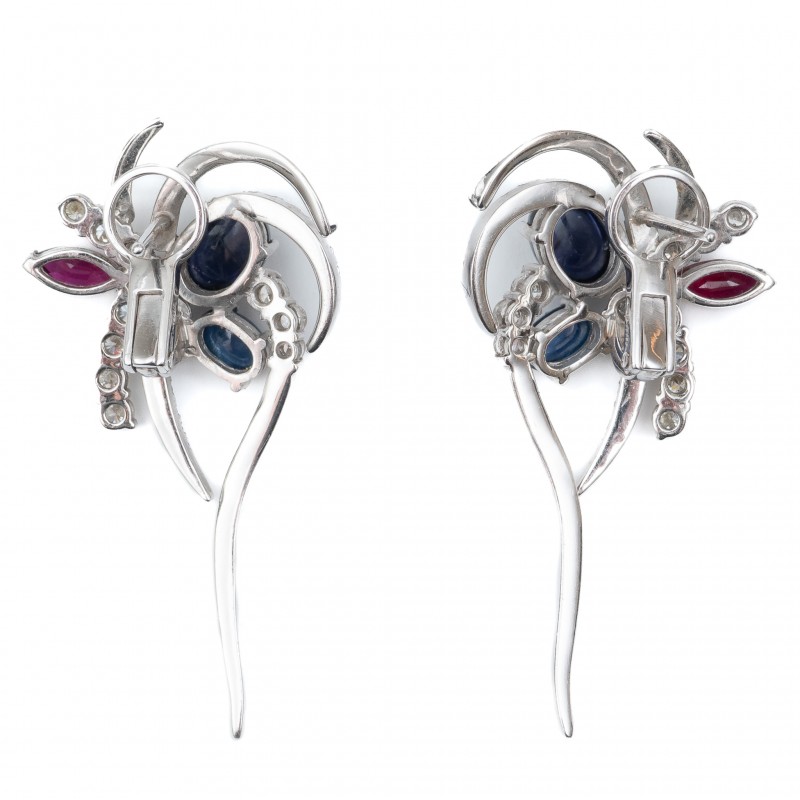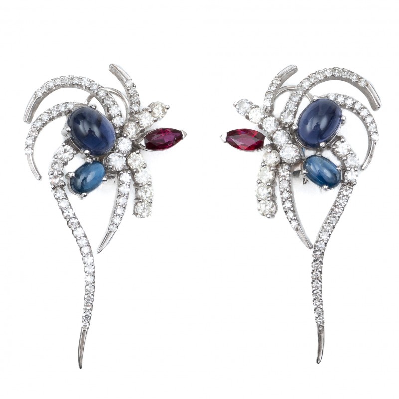 Em ouro branco 18K Com diamantes de aprox. 1.60 quilates SI K/L, cabouchon de safira e tanzanita, e navete de rubi Peso 14.9g Medida 4.5cm