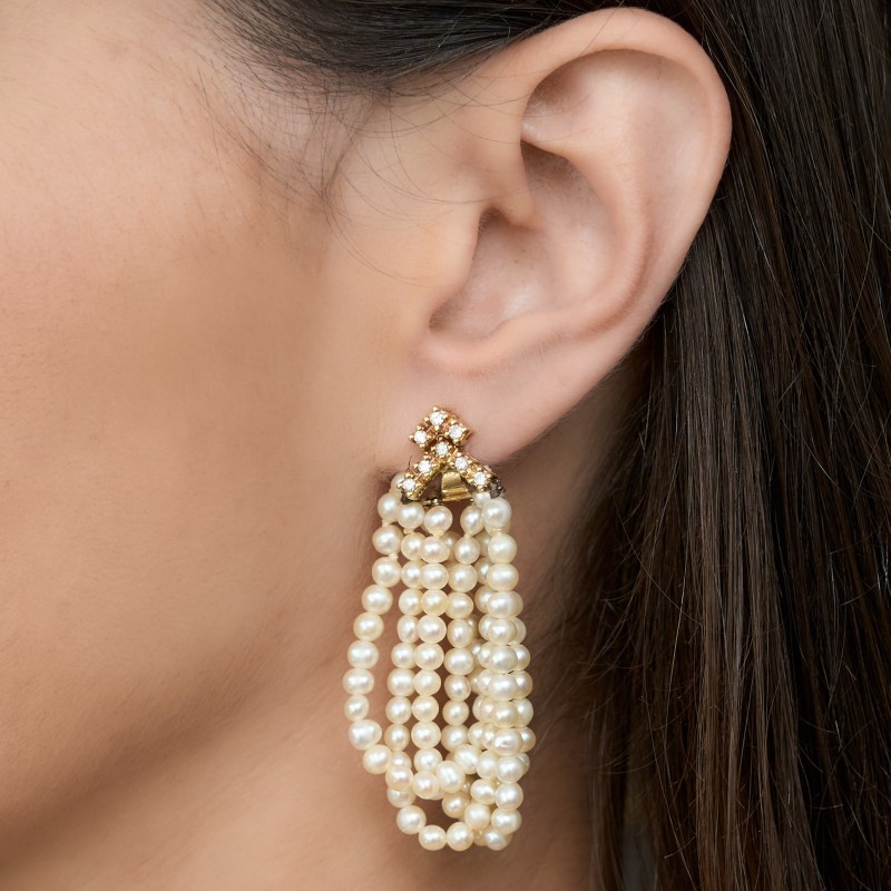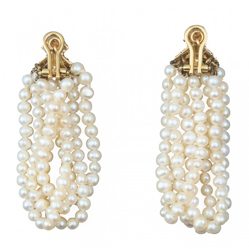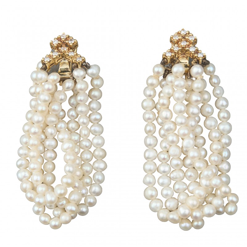 Em ouro amarelo 18K Com pérolas e diamantes de aprox. 0.60 quilates VS2/SI1 Peso 21.6g Medida 5.6cm