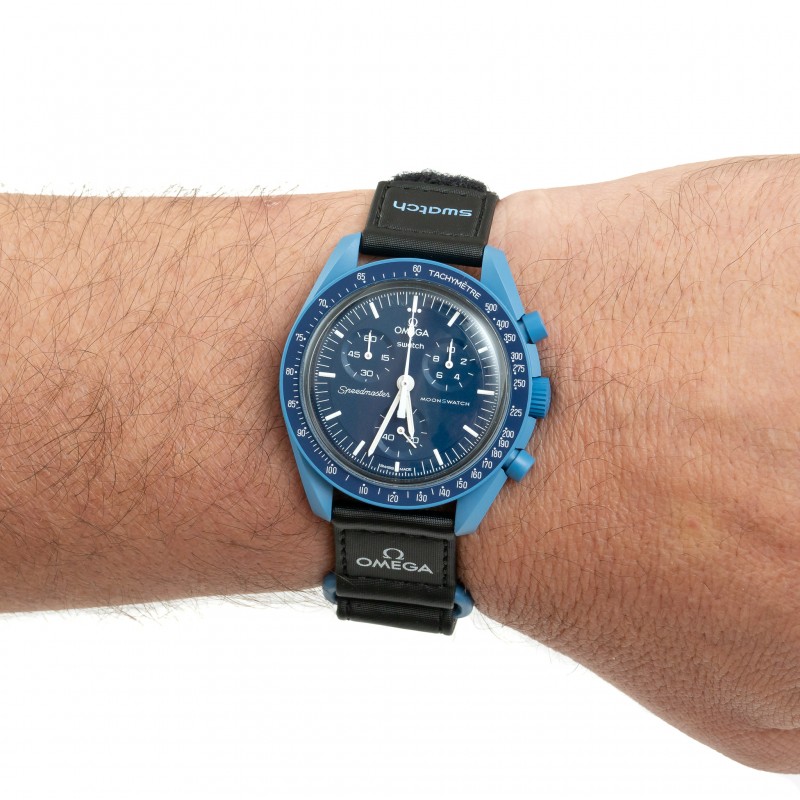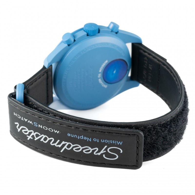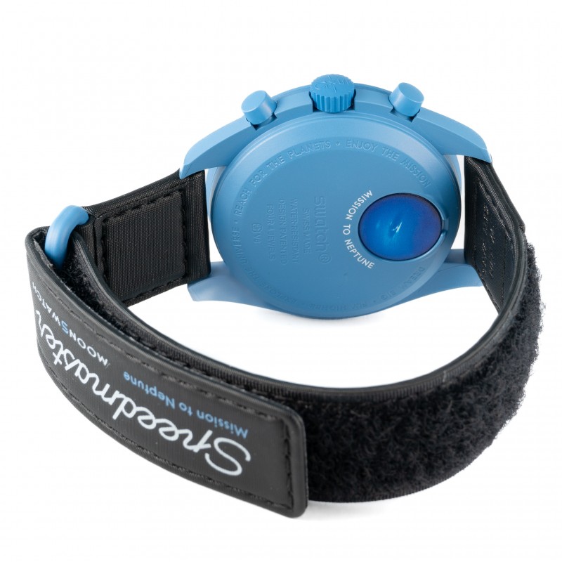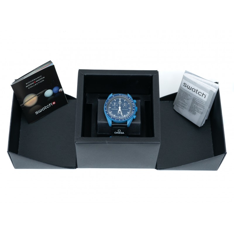 Caixa 42mm Plexiglas Quartz Cronógrafo Caixa em biocerâmica Mostrador azul Ref. SO33N100 Estojo e certificado SwatchxOmega