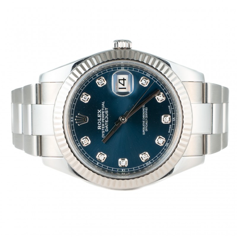 Caixa 41mm Safira Automático Bezel em ouro branco 18K Mostrador azul com diamantes Ref. 123334 Estojo MRjoias e certificado Rolex