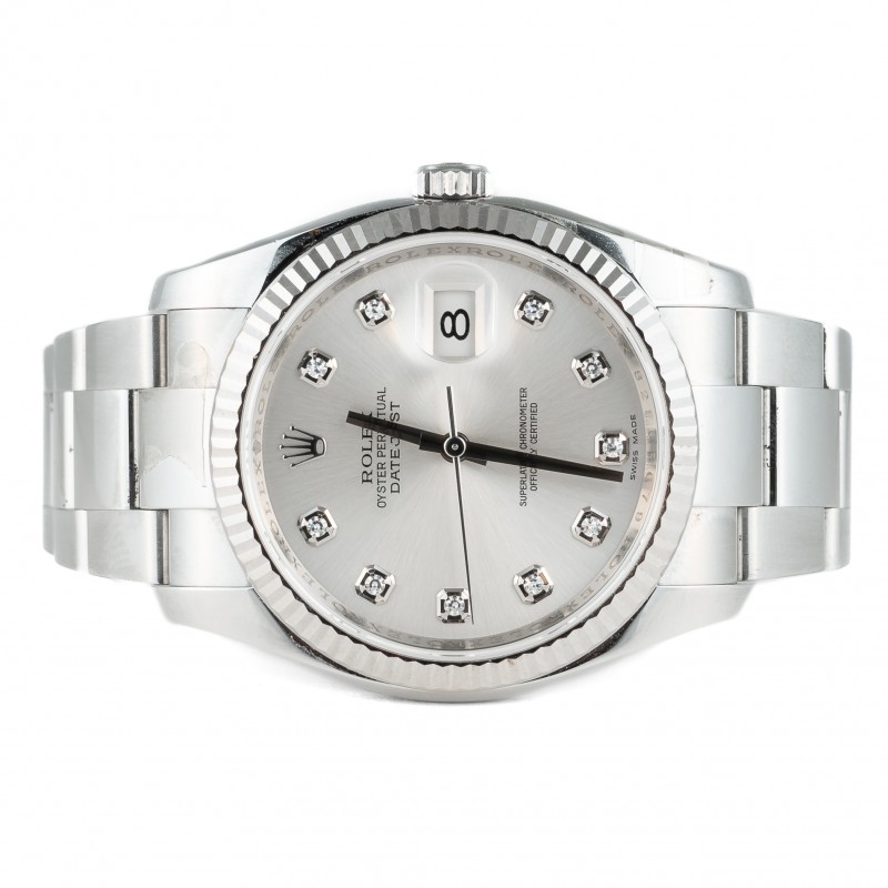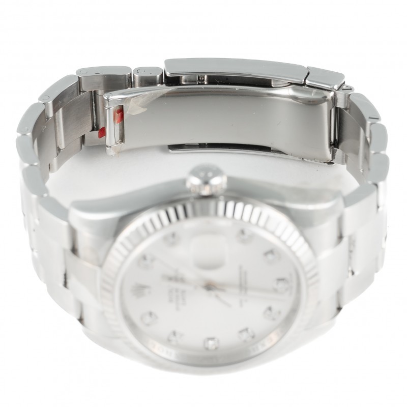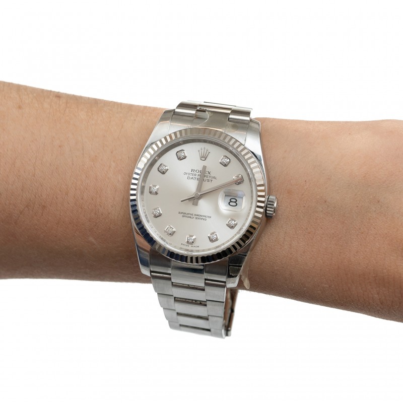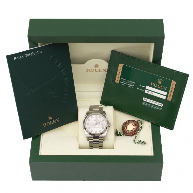 Caixa 36mm Safira Automático Bezel em ouro branco 18K Mostrador prata com diamantes Ref. 116234 Estojo e certificado Rolex